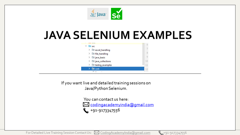 With this you will get a zip containing a java project which contains all real time examples for Java Selenium